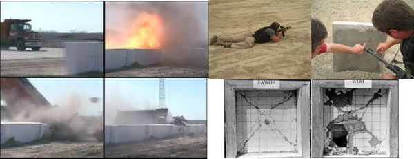 Bottom Right– Concrete Test pieces subjected to heavy gun fire with and without SFRC.